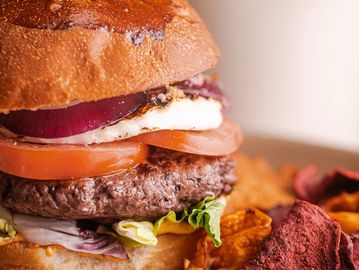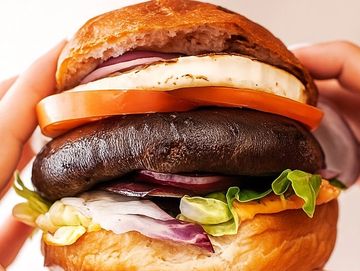 Pan de masa madre, portobello, queso panela, tomate, rodajas de cebolla, mayonesa de aguacate, acompañado de chips de camote y betabel deshidratado y un rico aderezo de la casa