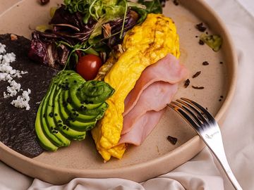 Huevo orgánico, jamón de pechuga de pavo, acompañado de ensalada fresca, frijoles, aguacate y pan de hogaza.