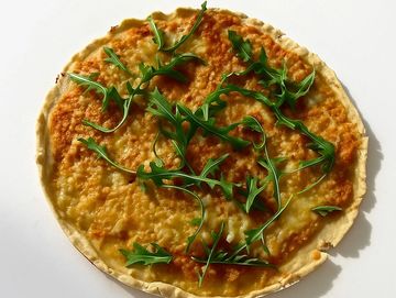 Pan de masa madre con pesto rojo, arúgula, mozarella, cebolla