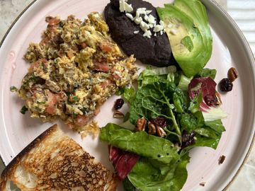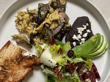 Huevo orgánico revuelto con hongos, acompañado de frijoles, ensalada fresca y pan de hogaza.