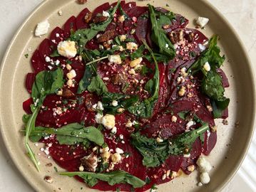 Betabel, arúgula, queso feta, mix de semillas y vinagre