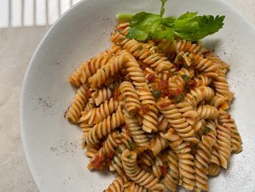 Pasta artesanal integral de la casa, salsa de tomate, alcaparras, aceite