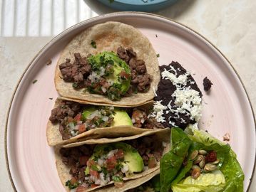 Cuatro tacos artesanales de carne magra, dos en torilla de maiz