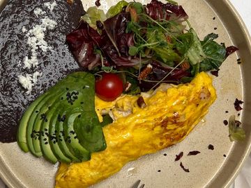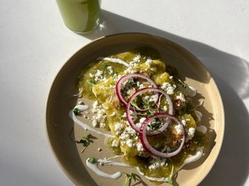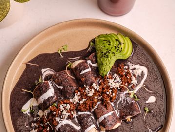 Tortilla de maíz rellena de huevo orgánico, bañada en salsa de frijol, chorizo de res, crema, aguacate y cilantro.