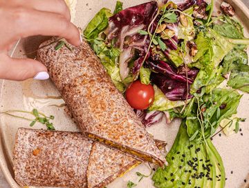 Huevo orgánico revuelto con pico de gallo y queso mozzarella, tortilla de granos germinados sin harina, acompañado de ensalada fresca y frijoles negros.
