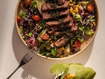 Mix de ensalada, filete de res, col morada, semillas,