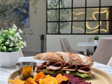 Pan de masa madre, roast beef, salsa tártara, tomate acompañado