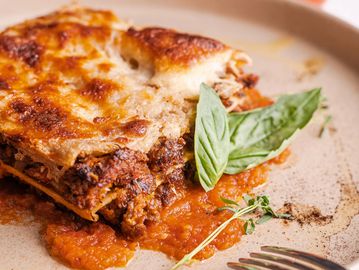 Pasta artesanal integral con salsa bechamel, salsa de tomate,