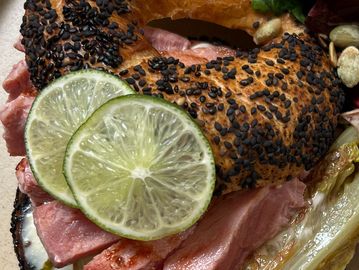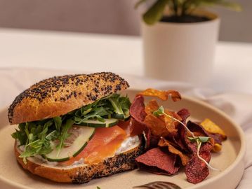 Pan de masa madre, salmón marinado, queso panela, arúgula,