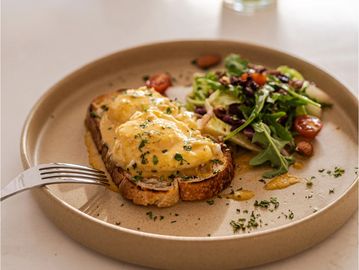 Huevo orgánico, salsa bechamel Vioasis, pan de hogaza, acompañado de ensalada fresca.