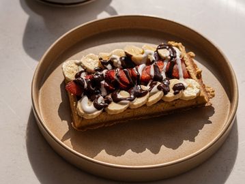 Harina de almendra, harina de avena, huevo, mantequilla ghee, plátano, fresa, yogurt griego y chocolate amargo líquido.