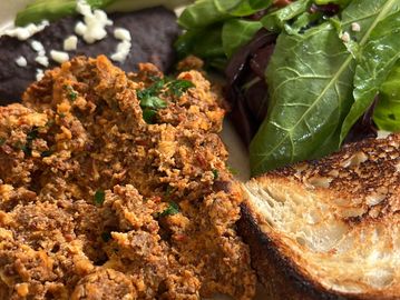 Huevo orgánico revuelto con machaca y pico de gallo, acompañado de frijoles negros, ensalada fresca y pan de hogaza.